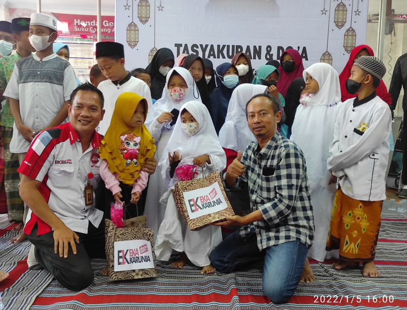 JATIMPOS.CO/LAMONGAN - Berharap keberkahan dari doa anak yatim, dealer Eka Karunia Motor Lamongan menggelar acara tasyakuran doa bersama dan santunan kepada puluhan anak yatim, Rabu (05/01/2022).
