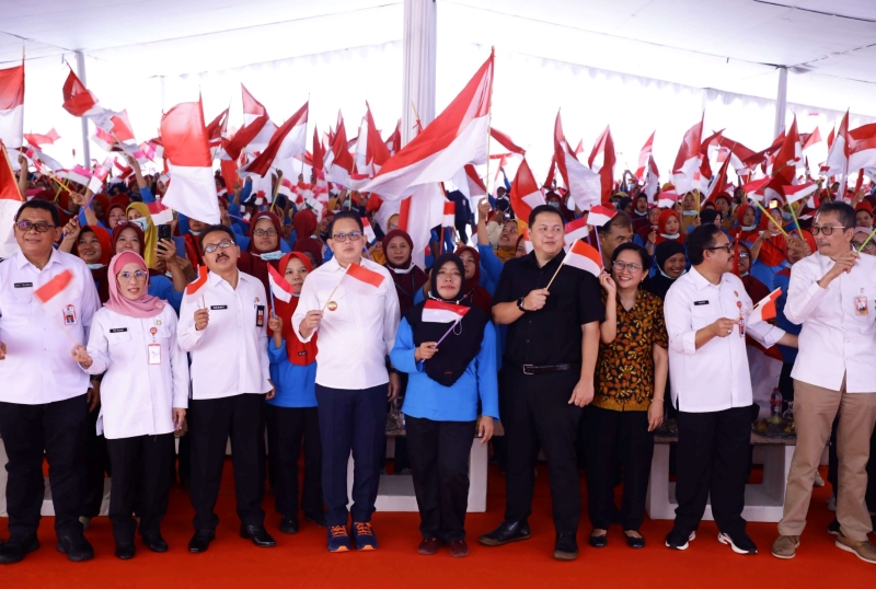 JATIMPOS.CO/SURABAYA - Penjabat (Pj) Gubernur Jawa Timur Adhy Karyono memimpin pelepasan sekitar 50 ribu peserta jalan sehat dalam rangka menyambut Tahun Baru Islam 1 Muharram 1446 H/2024 di Halaman Timur Masjid Nasional Al Akbar Surabaya, Sabtu (6/7) pagi.