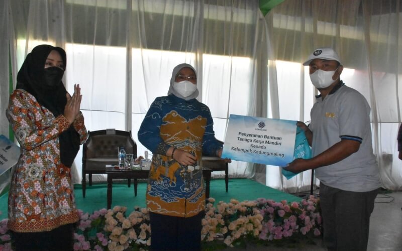 JATIMPOS.CO/KABUPATEN MOJOKERTO - Menteri Ketenagakerjaan (Menaker) Republik Indonesia, Ida Fauziah didampingi Bupati Mojokerto, dr. Ikfina Fahmawati menyerahkan bantuan program Tenaga Kerja Mikro (TKM) untuk lima kelompok pelaku usaha perdagangan kaki lima Kabupaten Mojokerto.