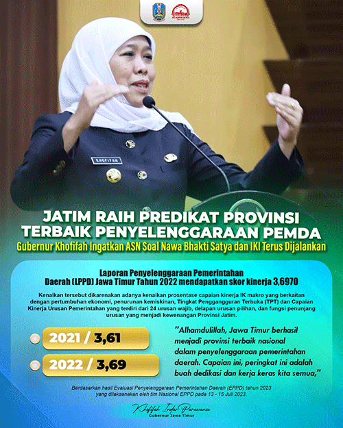 JATIMPOS.CO//SURABAYA - Provinsi Jawa Timur mendapatkan predikat provinsi terbaik dalam penyelenggaraan pemerintahan daerah di Indonesia oleh Kementerian Dalam Negeri RI. Hal ini tertuang dalam Keputusan Mendagri No. 100.2.1.7-6646 tanggal 21 Desember 2023 yang disampaikan kepada semua pemerintahan daerah se-Indonesia di kantor Kemendagri RI .