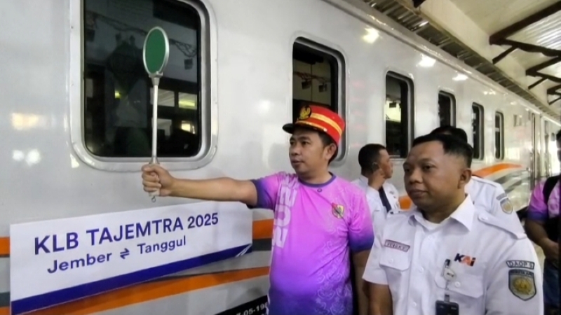 JATIMPOS.CO/KABUPATEN JEMBER - Gerak jalan Tajemtra (Tanggul Jember Tradisional) resmi digelar, peserta yang banyak datang dari beberapa kota dan pusat kota Jember, diberikan akses transportasi gratis melalui Kereta Api Luar Biasa (KLB) yang disiapkan oleh PT KAI Daops 9 Jember, Sabtu (23/08/2025).