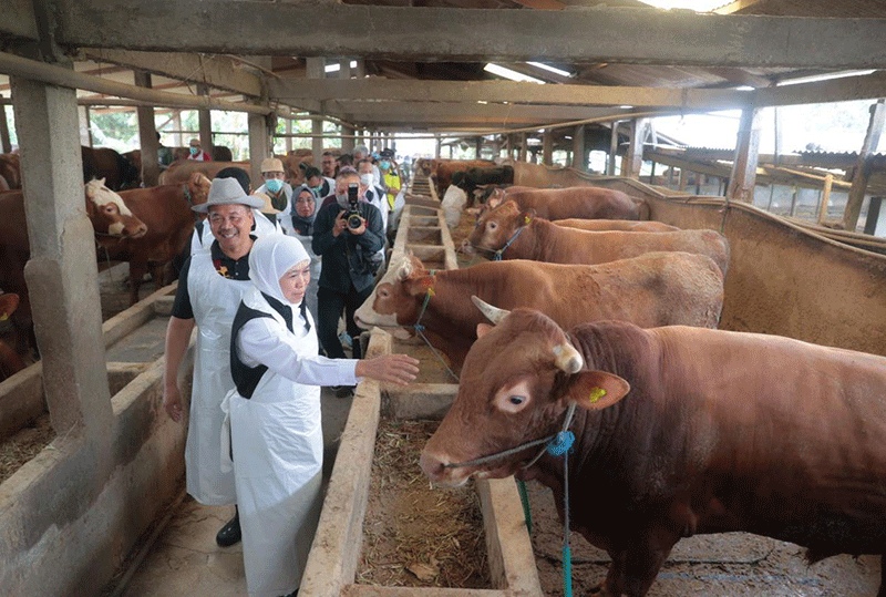 JATIMPOS.CO/LAMONGAN - Menyambut Hari Raya Idul Adha tahun 2023, Gubernur Jawa Timur Khofifah Indar Parawansa blusukan meninjau kandang hewan kurban di Dusun Pilanggot, Desa Wonokromo, Kec. Tikung, Kab.Lamongan, Selasa (6/6).