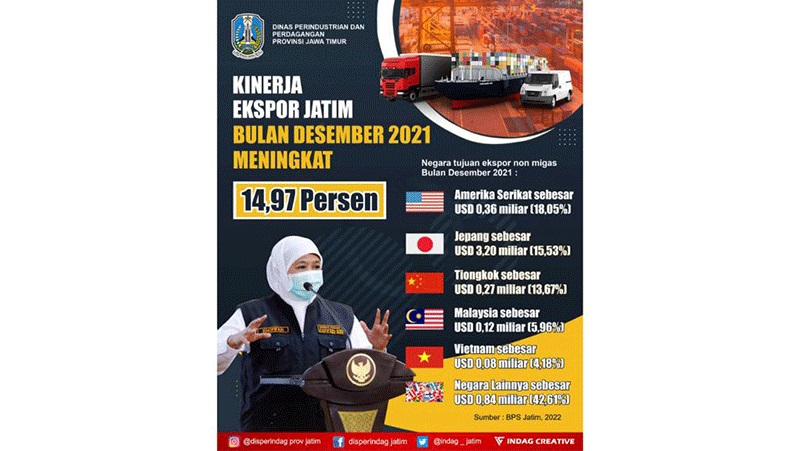 JATIMPOS.CO/SURABAYA - Kinerja Pemprov Jatim dalam rangka pemulihan perekonomian di tengah pandemi Covid-19 tercatat membuahkan hasil. Badan Pusat Statistik (BPS) mencatat kenaikan nilai ekspor Jatim di akhir 2021 year on year mengalami kenaikan 14,97 persen.