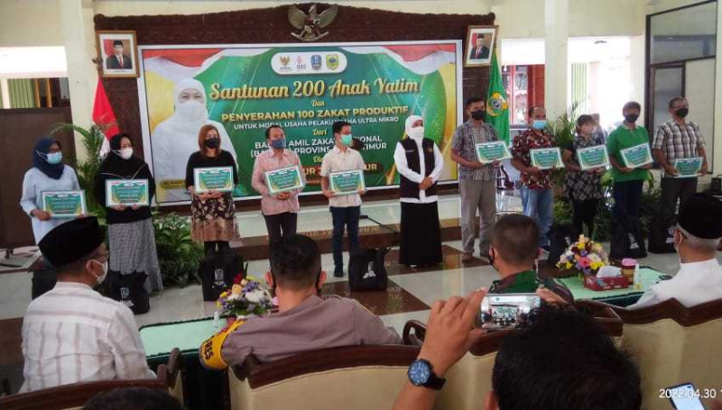 JATIMPOS.CO/BONDOWOSO - Gubernur Jawa Timur Khofifah Indar Parawansa menyerahkan beragam santunan kepada ratusan anak yatim dan abang becak serta 100 zakat produktif modal untuk pelaku usaha ultra mikro. Bantuan tersebut diberikan bekerja sama dengan Baznas Jatim serta Pemprov Jatim di Pendopo Bupati Bondowoso, Sabtu (30/4/2022).