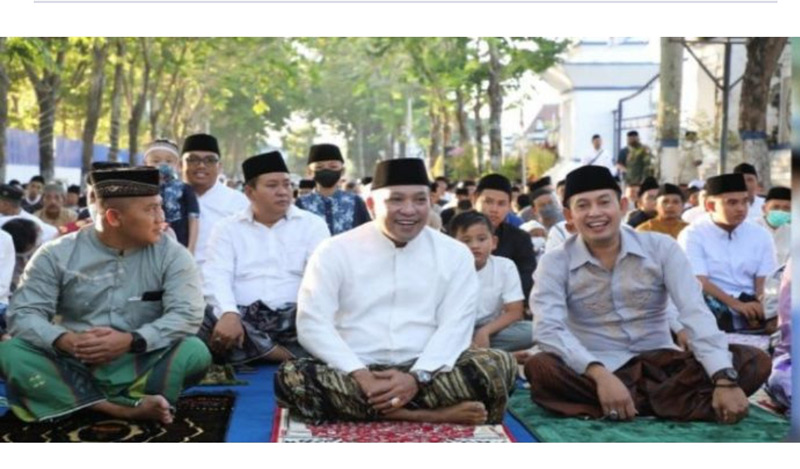 JATIMPOS.CO//SAMPANG- Bupati H. Slamet Junaidi dan Wakil Bupati H. Abdullah Hidayat, Sekdakab H. Yuliadi Setiyawan, Forkopimda bersama masyarakat melaksanakan solat hari raya Idul Fitri di Jln Wijaya Kusuma depan Pendopo Bupati Sampang, Senin (2/5/2022).