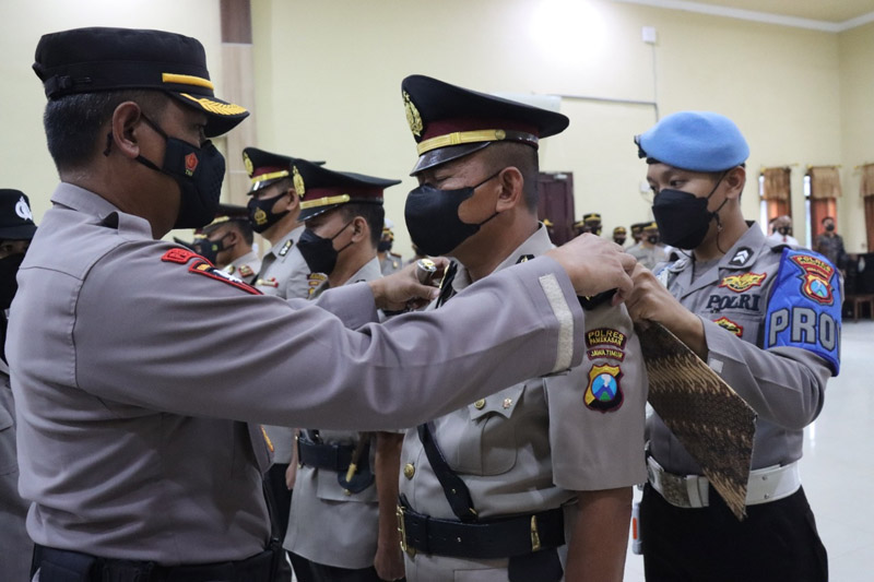 JATIMPOS.CO/PAMEKASAN - Sebanyak Dua Pejabat Utama (PJU) dan satu Kapolsek di jajaran Polres Pamekasan resmi berganti. Upacara serah terima jabatan (sertijab) ini dipimpin langsung Kapolres Pamekasan AKBP Rogib Triyanto dengan menerapkan protokol kesehatan (Prokes) ketat. Pelaksanaan sertijab sendiri dilaksanakan pada Selasa (26/4/2022) di Gedung Bhayangkara Polres Pamekasan.