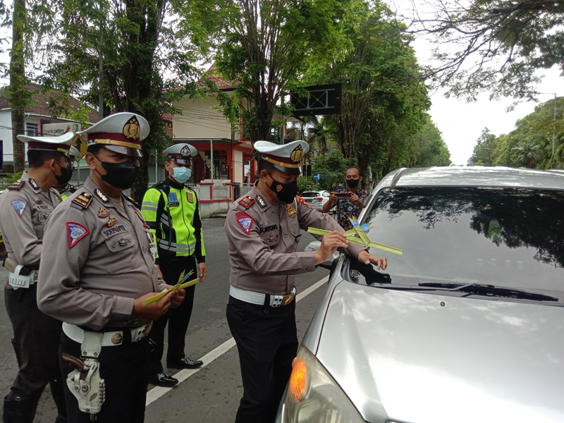 JATIMPOS.CO/BONDOWOSO - Satlantas Polres Bondowoso gelar sosialisasi pemasangan tanda janur kuning kepada pengendara, hal ini dilakukan untuk menandai bagi setiap pengendara yang melanggar tata tertib lalu lintas, di pusat kota Bondowoso, Rabu (20/4/2022).