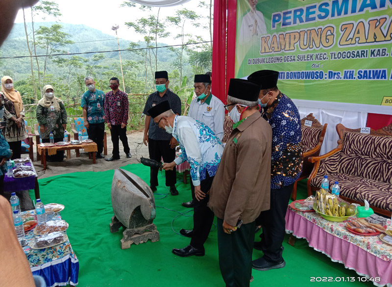JATIMPOS.CO/BONDOWOSO - Ditandai pemukulan kentongan, Bupati Bondowoso KH Salwa Arifin resmikan kampung zakat Sumber Berkah berbentuk kelompok ternak kambing di Desa Sulek Kecamatan Tlogosari, Bondowoso, Kamis (13/1/2022).