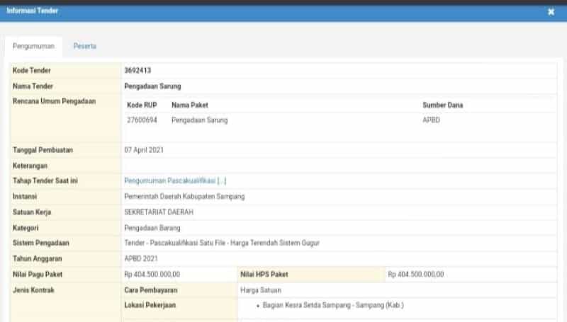 JATIMPOS.CO/SAMPANG - Pemerintah Kabupaten Sampang melalui lembaga Layanan Pengadaan Secara Elektronik (LPSE) diketahui memproses lelang pengadaan sarung dengan pagu anggaran sampai Rp 404.500.000,00 (Empat ratus empat juta lima ratus ribu rupiah).