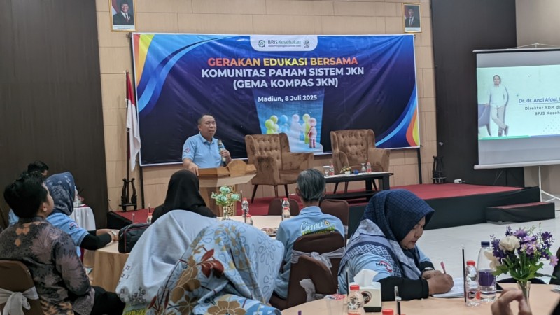 JATIMPOS.CO/KOTA MADIUN – Dalam rangka memperingati Hari Ulang Tahun (HUT) ke-57, BPJS Kesehatan terus menggencarkan edukasi program Jaminan Kesehatan Nasional (JKN) melalui kegiatan bertajuk Gerakan Edukasi Bersama Komunitas Paham Sistem JKN atau GEMA KOMPAS JKN. Salah satu kegiatan tersebut digelar di Rumah Makan Ayam Goreng Pemuda, Kota Madiun, Selasa (8/7/2025).