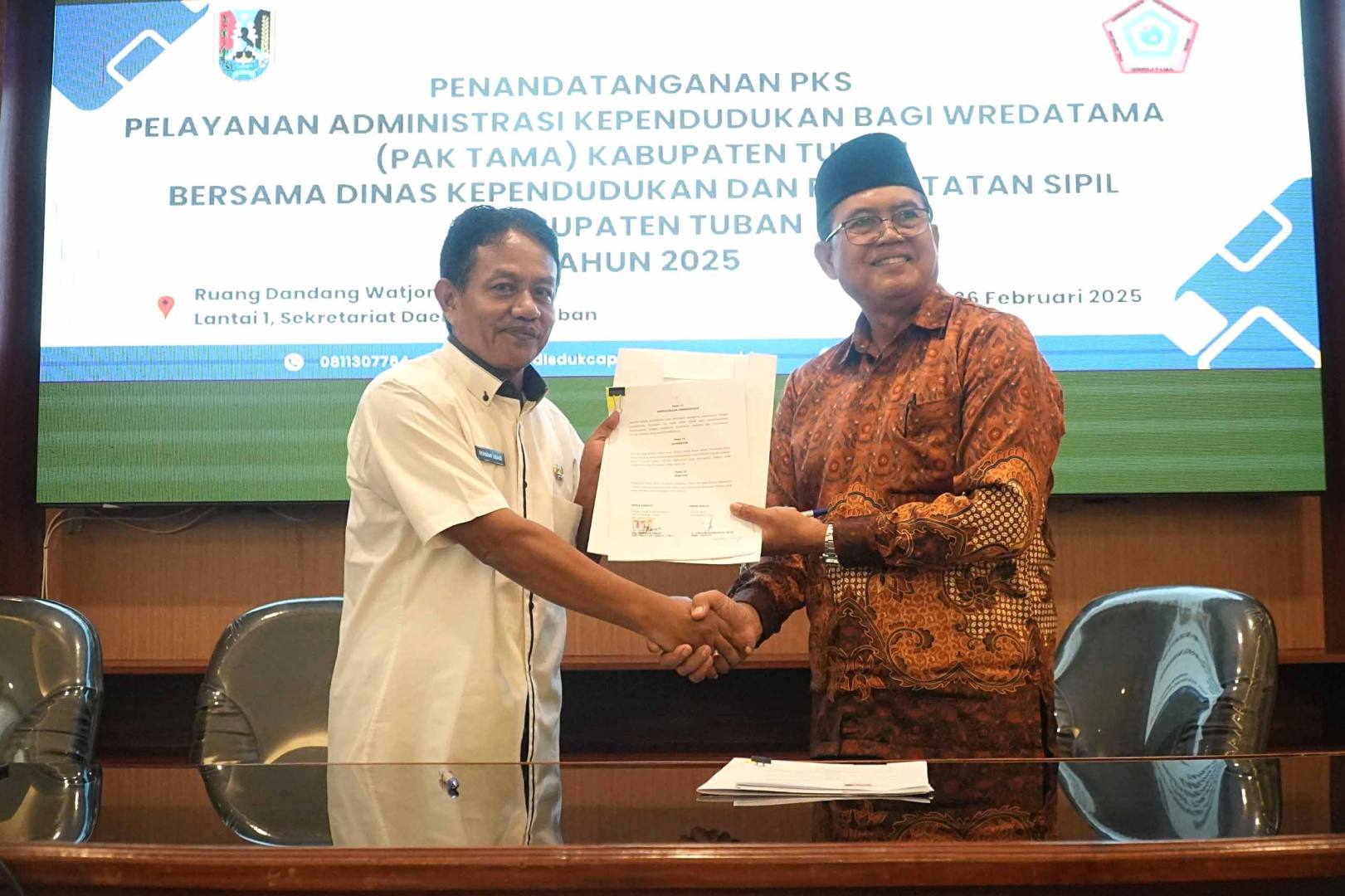 JATIMPOS.CO/TUBAN - Dinas Kependudukan dan Pencatatan Sipil (Disdukcapil) menandatangani Perjanjian Kerja Sama (PKS) dengan Persatuan Wredatama Republik Indonesia (PWRI) Kabupaten Tuban. PKS tentang layanan administrasi kependudukan bagi wredatama atau pensiunan aparatur sipil negara (ASN). Acara di Ruang Rapat Dandang Wacana, Sekretariat Daerah Tuban, Rabu (26/2/2025).
