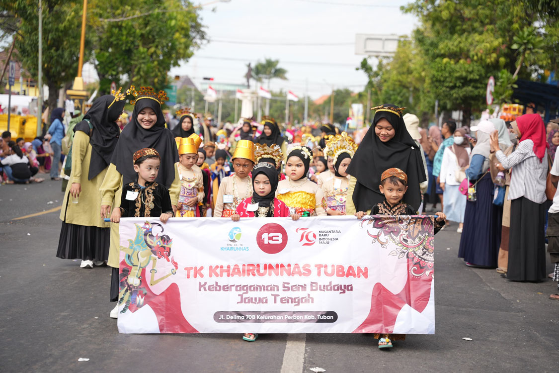 JATIMPOS.CO/TUBAN – Sedikitnya ada 56 lembaga Sekolah Taman Kanak-Kanak (TK) sederajat mengikuti Karnaval Budaya Nusantara. Acara mengusung tema "Dengan Semangat Merah Putih, Kita Siap Menyongsong Nusantara Baru, Indonesia Maju".