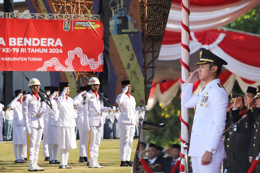 JATIMPOS.CO/TUBAN – Upacara Pengibaran Bendera Peringatan HUT ke-79 Kemerdekaan RI Tahun 2024 Pemkab Tuban berlangsung khidmat, Sabtu (17/08/2024). Berbeda dengan tahun sebelumnya, Upacara Bendera tahun ini dilangsungkan di GOR Rangga Jaya Anoraga Tuban.