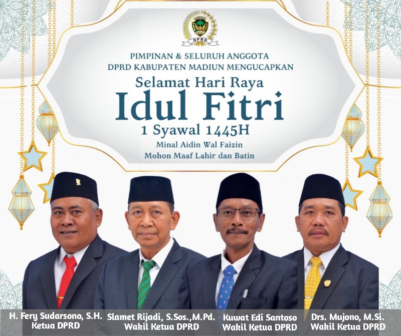 Pimpinan dan seluruh anggota DPRD Kabupaten Madiun mengucapkan Selamat Hari Raya Idul Fitri 1 Syawal 1445 Hijriah/2024 Masehi.