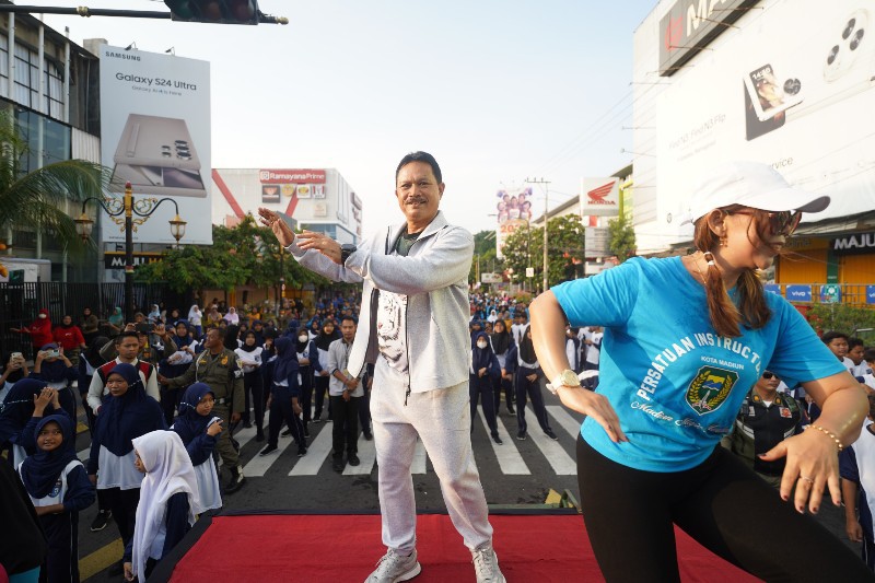 JATIMPOS.CO/KOTA MADIUN - Dalam rangka mendukung Gerakan Masyarakat Hidup Sehat (Germas), Pemerintah Kota (Pemkot) Madiun menggelar senam bersama Wali Kota Madiun di area Pahlawan Street Center (PSC) Kota Madiun, Jumat (1/3/2024). Sebanyak 15 ribu peserta dari berbagai unsur elemen masyarakat mengikuti senam sehat tersebut.