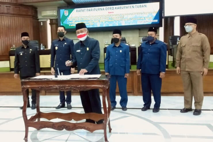 JATIMPOS.CO/TUBAN – Raperda P-APBD 2021 Kabupaten Tuban secara resmi telah ditandatangani. Penandatanganan ini bentuk persetujuan bersama antara Bupati dengan pimpinan DPRD yang dituangkan dalam rapat paripurna pada Kamis (26/08).