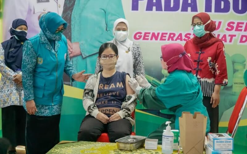 JATIMPOS.CO/KOTA MADIUN – Ketua TP PKK Kota Madiun Yuni Setyawati Maidi meninjau pelaksanaan vaksinasi ibu hamil di RSUD Kota Madiun, Kamis (26/8/2021).
