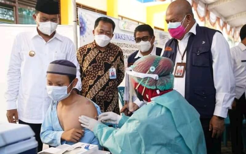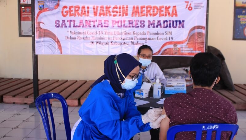 JATIMPOS.CO/MADIUN - Untuk mendukung program pemerintah dalam mempercepat vaksinasi guna mencapai herd immunity Nasional, Polres Madiun menggelar Gerai Vaksin Merdeka bagi para pemohon Surat Izin Mengemudi (SIM) di Satpas Polres Madiun, Rabu (18/8/2021).