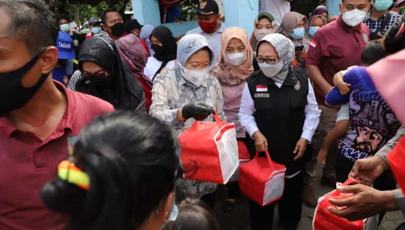 JATIMPOS.CO/JOMBANG - Menteri Sosial (Mensos) RI, Tri Rismaharini didampingi Bupati Jombang Hj. Mundjidah Wahab menyerahkan bantuan kepada warga terdampak banjir di Kecamatan Bandar Kedungmulyo, Kabupaten Jombang, Jawa Timur, Sabtu (13/02/2021).