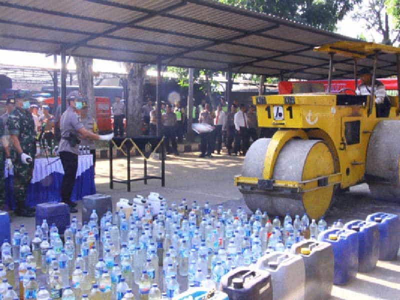 Menurut Kapolres Madiun, AKBP Ruruh Wicaksono miras yang dimusnahkan dengan cara dilindas alat berat tersebut ada sebanyak 1746,5 liter arak jowo, 25 botol anggur kolesom 620 ML, 11 botol Vodka 350 ML, 5 botol Vodka 950 ML, 60 botol jamu akar Mahkota Dewa 150 ML, dan 10 botol bir Bintang berisi arak jowo 620 ML.