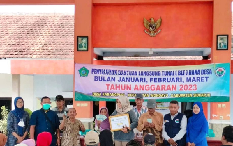 JATIMPOS.CO/SIDOARJO - Pemerintahan Desa Karangpuri Kecamatan Wonoayu Kabupaten Sidoarjo, menyalurkan Bantuan Langsung Tunai Dana Desa (BLT-DD) tahap pertama tahun anggaran 2023, di pendopo balai desa, Jumat (24/3/2023).