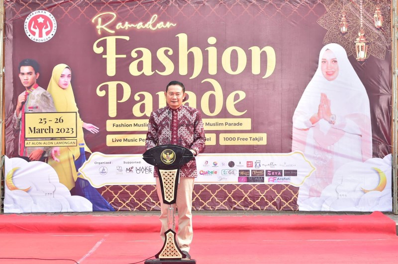 JATIMPOS.CO/LAMONGAN - Beragam event digelar untuk menyemarakkan Bulan Suci Ramadan di Kabupaten Lamongan, tak ketinggalan, Dewan Kerajinan Nasional (Dekranasda) Kabupaten Lamongan menggelar Ramadan Fashion Parade Tahun 2023 di Alun-alun Lamongan, Sabtu (25/03/2023).