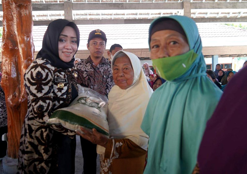 JATIMPOS.CO/KABUPTEN MOJOKERTO - Bupati Mojokerto Ikfina Fahmawati didampingi Kadispari Kabupaten Mojokerto Moch. Ridwan menyalurkan bantuan Cadangan Pangan Pemerintah (CPP) secara simbolis kepada 756 Keluarga Penerima Manfaat (KPM) di Desa Japanan Kecamatan Kemlagi, Selasa (11/4/2023) pagi.