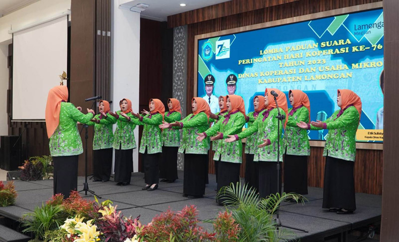 JATIMPOS.CO/LAMONGAN - Memperingati Hari Koperasi Nasional (Harkopnas) ke 76, Dinas Koperasi dan Usaha Mikro Kabupaten Lamongan menggelar lomba paduan suara yang ditujukan untuk paguyuban koperasi wanita.