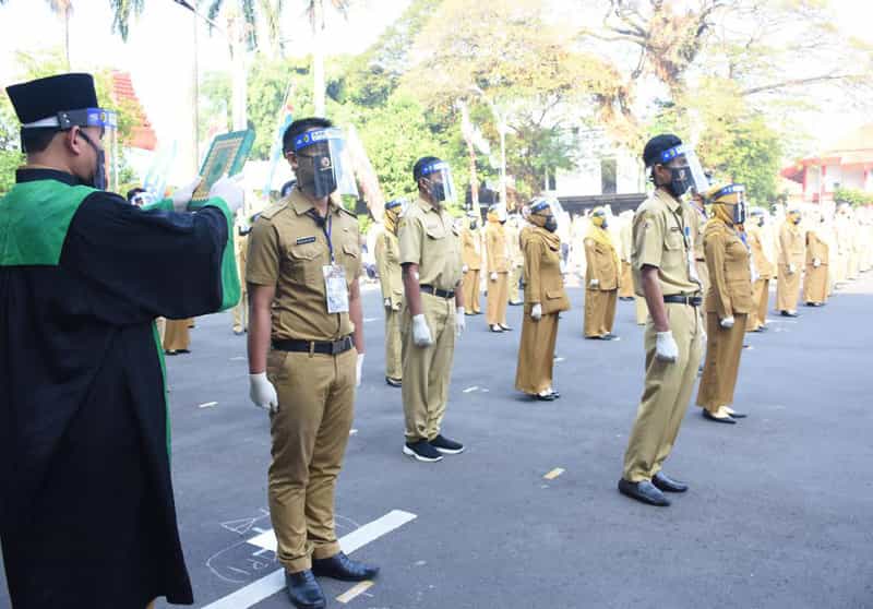 JATIMPOS.CO/KABUPATEN MOJOKERTO - Sedikitnya 216 Orang terbagi atas 205 Pegawai Negeri Sipil (PNS) dan 11 Jabatan Fungsional Guru, dilantik dan diambil sumpahnya oleh Bupati Mojokerto H.Pungkasiadi SH, di halaman Pemerintah Kabupaten Mojokerto, Senin (29/6/2020).
