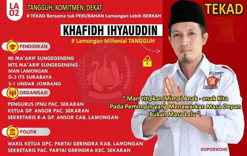 Terbaru muncul nama Kafid Ihyauddin, sosok Kader Muda dari Partai Gerindra Lamongan yang beberapa minggu ini viral di medsos dan menjadi buah bibir masyarakat Lamongan. Diri nya bercerita lama dalam pengabdian sosial masyarakat di dalam Ansor. Bahkan lebih dari 10 tahun, pernah menjabat ketua Ansor PAC Sekaran selama 8 tahun. Amanah menjadi Sekretaris Rijalul Ansor cabang lamongan juga pernah di emban nya selama 3 tahun. Masyarakat Sekaran, anggota Ansor dan Banser sangat tak asing dengan sosok nya dan sering menyebut dengan panggilan akrab, “Cak Khafid”.