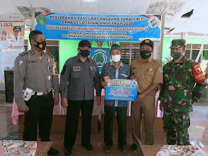 Penyerahan BLT-DD Secara simbolis diberikan langsung oleh Kepala Desa Plosowahyu, Agus Susanto yang didampingi Babinsa, tim Bank Jatim dan perwakilan dari Forkopimcam kepada warga penerima batuan. Senin (24/08/20).
