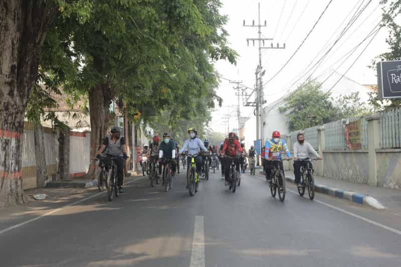 Wali Kota Mojokerto, Ika Puspitasari bersama Dandim 0815 Mojokerto, Letkol (Inf) Dwi Mawan Sutanto, Kapolresta Mojokerto AKBP Deddy Supriadi serta Kajari Kota Mojokerto Johan Iswahyudi Patroli Bersepeda memantau Penegakkan Hukum Protokol Kesehatan dan Membagikan Masker Minggu Pagi (11/10/2020).