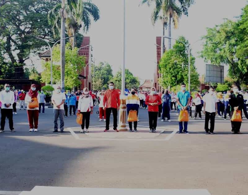 JATIMPOS.CO //KABUPATEN MOJOKERTO,- Cuti dari Jabatan Bupati, karena ikuti Pilkada serentak 2020. Bupati Mojokerto Pungkasiadi berpesan pada seluruh karyawan-karyawati Pemerintah Kabupaten Mojokerto untuk tetap produktif dan tak kendor meski harus bekerja dalam masa pandemi Covid-19. Wejangan tersebut dituturkan pada kegiatan senam bersama serta pemberian bantuan sembako pada 306 orang tenaga harian lepas (THL) lingkup pemkab dan kecamatan.