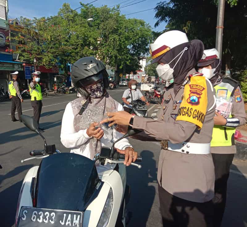 JATIMPOS.CO/LAMONGAN - Kasatlantas Polres Lamongan, AKP Fybrien Senja Indah Lestari, SIK memberikan hadiah poligrab dan hand sanitizer kepada masyarakat pengguna jalan yang disiplin patuh berlalu lintas dan patuh protokol kesehatan (Prokes) Covid-19.
