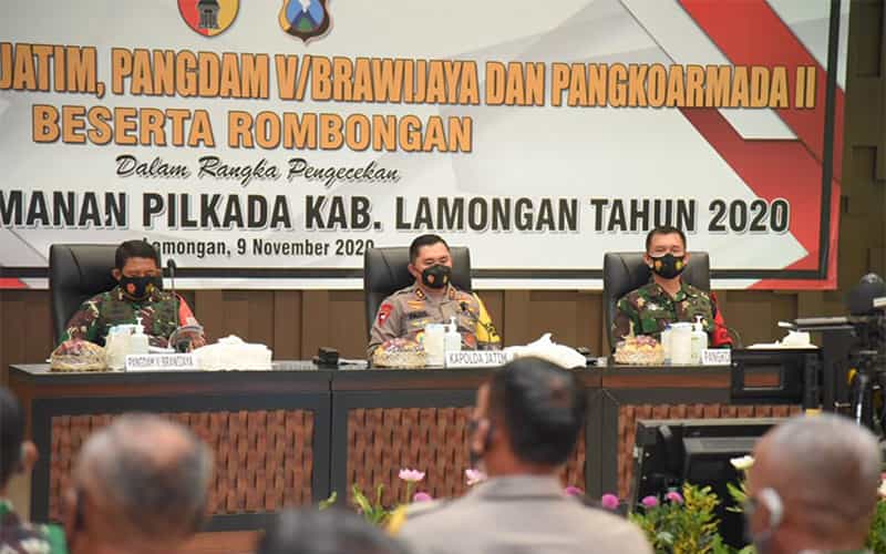 Sementara itu Kapolda Jatim Irjen Pol M. Fadil Imran memaparkan Indeks potensi kerawanan Pilkada tahun 2020 Provinsi Jatim masih dalam indeks aman. Kapolda Jatim juga menghimbau kepada Forkopimda Lamongan agar benar benar memantau 3 peserta Paslon yang mengikuti Pilkada untuk selalu di monitor kerawanannya selama massa kampanye.