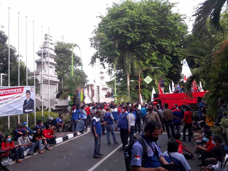 JATIMPOS.CO/SIDOARJO - Demo menuntut kenaikan upah pekerja untuk tahun 2021 kepada Pj Bupati Sidoarjo Hudiyono, dilakukan Federasi Serikat Pekerja Metal Indonesia (FSPMI) di depan pendopo delta wibawa, Jumat (13/11/2020).