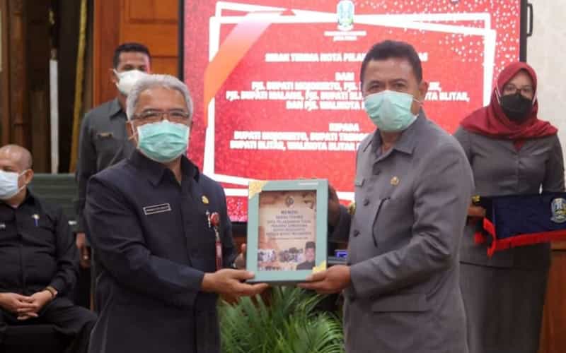Serah terima Nota Pelaksanaan Tugas Bupati Mojokerto, dari Penjabat Sementara (Pjs) Bupati Mojokerto, Himawan Estu Bagijo kepada Bupati Mojokerto H. Pungkasiadi ditandatangani dan disaksikan langsung Gubernur Jawa Timur Khofifah Indar Parawansa di Gedung Negara Grahadi Surabaya, Sabtu (5/12/2020) malam.