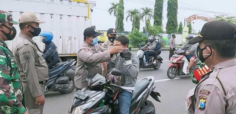 JATIMPOS.CO/GRESIK – Pada hari Senin tanggal 11 Januari 2021 merupakan hari pertama pemberlakuan pembatasan kegiatan masyarakat (PPKM), bertempat di Depan Mapolsek Jln Raya Duduksampeyan Kecamatan Duduksampeyan, Personel Polsek Duduksampeyan di pimpin langsung Kapolsek Duduksampeyan AKP Nur Sugeng Ari Putra SH melaksanakan penegakan protokol kesehatan sebagai implementasi dari inpres No.6 tahun 2020, Senin (11/01/2021).