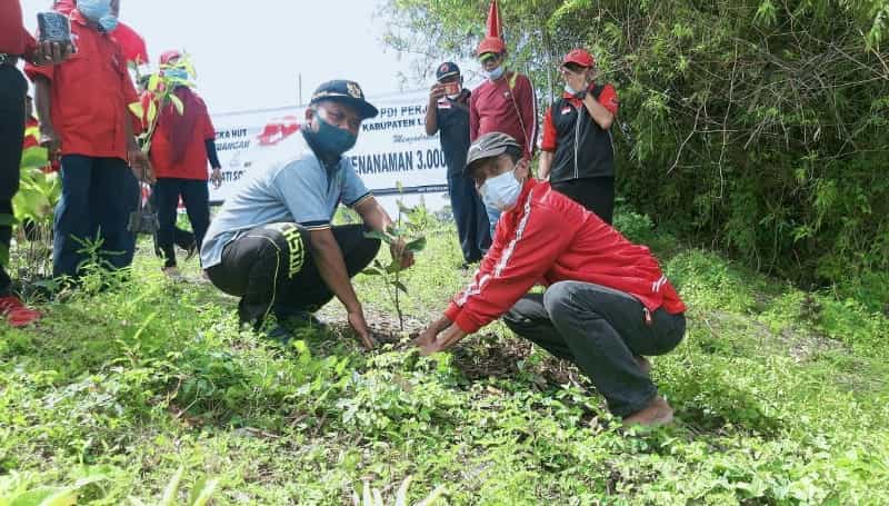 JATIMPOS.CO/LAMONGAN - Dalam rangka menyemarakkan Hari Ulang Tahun (HUT) PDI Perjuangan ke-48 dan ulang tahun Megawati Sukarnoputri ke-74, jajaran pengurus DPC PDI Perjuangan bersama Fraksi PDI-P DPRD Lamongan bekerjasama dengan Pemdes Plosowahyu mengadakan penanaman 4.800 bibit pohon penghijauan di sepanjang Bantaran Sungai Plalangan Desa Plosowahyu, Lamongan, Jawa Timur, Selasa (26/01/2021).