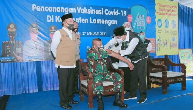 “Saya telah melakukan vaksinasi untuk yang pertama di Lamongan. Empat tahapan yang dilalui mulai dari pendataan, pemeriksaan, vaksinasi, dan pemeriksaan tahap akhir berjalan lancar. Yang saya rasakan saat ini tidak ada perubahan yang signifikan di tubuh saya,” ujar Dandim Lamongan usai divaksinasi.