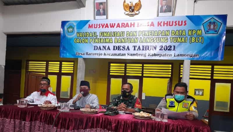 JATIMPOS.CO/LAMONGAN - Guna pendataan sesuai kriteria penerima Bantuan Langsung Tunai Dana Desa (BLT DD) tahun 2021, Pemerintah Desa Barurejo Kecamatan Sambeng Kabupaten Lamongan melakukan Musyawarah Desa (Musdes) validasi, finalisasi dan penetapan calon penerima BLT DD tahun 2021.