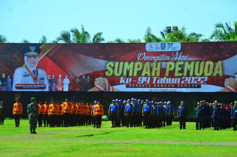 JATIMPOS.CO/KABUPATEN MADIUN - Pemerintah Provinsi (Pemprov) Jawa Timur (Jatim) menggelar upacara peringatan Hari Sumpah Pemuda ke - 94 tahun 2022 di Alun - alun Reksogati, Caruban, Kabupaten Madiun, Jum'at (28/10/2022).