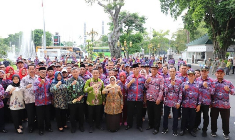 JATIMPOS.CO/JOMBANG - Bupati Jombang, Hj Mundjidah Wahab, didampingi Kepala Dinas Pemberdayaan Masyarakat dan Desa (DPMD) Kabupaten Jombang, Sholahuddin Hadi Sucipto, dari halaman Pendopo Kabupaten Jombang, memberangkatkan 800 orang yang tergabung dalam kelompok Persatuan Perangkat Desa Indonesia (PPDI) Kabupaten Jombang, untuk mengikuti Silatnas (Silaturahmi Nasional) PPDI Jilid III di Jakarta, Selasa (24/01/2023).