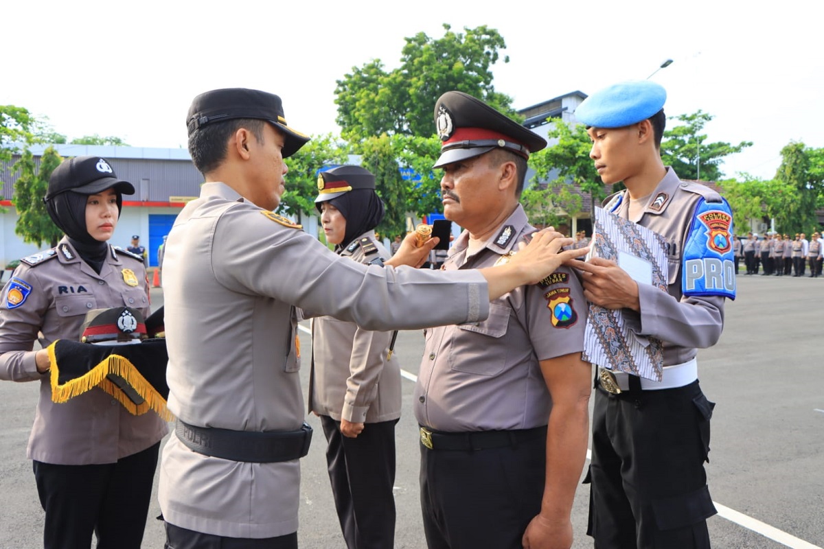 Upacara pelepasan pangkat lama dan penyematan tanda pangkat baru dipimpin langsung Kapolres AKBP Rahman Wijaya dihadiri para pejabat utama, kapolsek serta personil di lapangan apel, Polres Tuban, Rabu (5/4/2023).