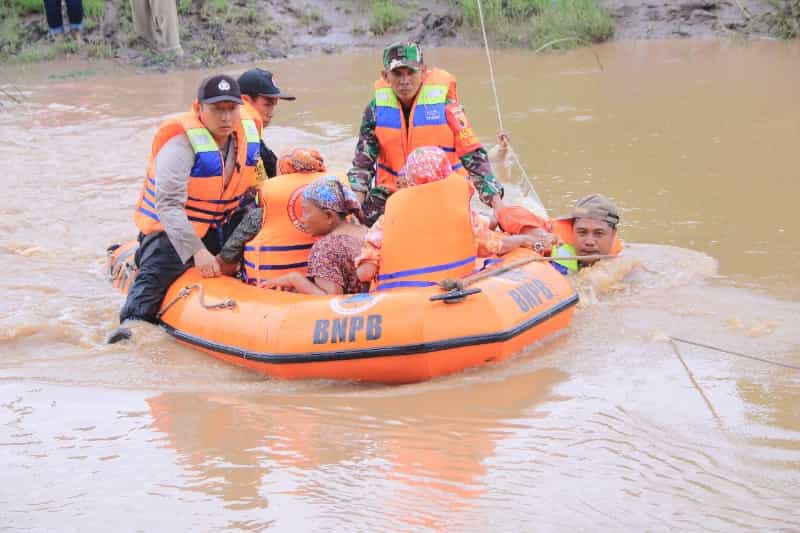 Secara terpadu, petugas gabungan dari TNI, Polri dan BPBD melaksanakan simulasi evakuasi masyarakat yang terisolasi banjir.