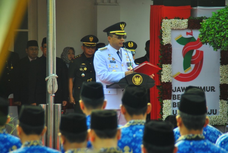 Upacara Hari Jadi ke - 79 Provinsi Jawa Timur dengan tema "Jawa Timur Bersatu Bersama Untuk Maju" ini dipimpin oleh Pj Wali Kota Madiun, Eddy Supriyanto selaku Inspektur upacara.