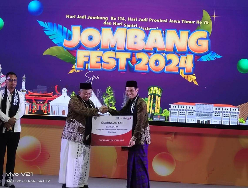 "Selaras dengan Inovasi "Besut Buka Gerbang Emas", Dinas Kesehatan Kabupaten Jombang merupakan bentuk gambaran dari usaha pemberantasan stunting di Kabupaten Jombang. Salah satu kegiatannya adalah dengan memberikan bantuan susu pada kasus stunting dengan gizi kurang atau jelek," ungkap Hanif selaku Pimpinan Bank Jatim Cabang Jombang, Senin (14/10/2024) di Alun-Alun Jombang lokasi acara Jombang Fest 2024.
