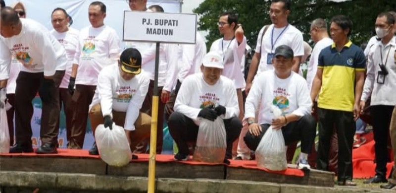 Usai melakukan peresmian kantor Kejari Kabupaten Madiun, sebagai wujud dukungan terhadap program pemerintah pusat yaitu Asta Cita Ketahanan Pangan, Pj Bupati Madiun bersama Kajati Jatim berserta rombongan melakukan penebaran 100.000 bibit ikan tawes di waduk Bening Saradan, selain itu juga melakukan pelepasan 1000 burung derkuku dan perkutut.