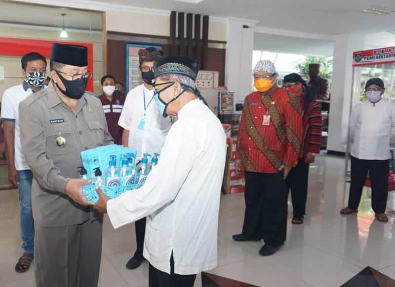 JATIMPOS.CO/KOTA BLITAR - Plt Wali Kota Blitar Drs H Santoso menyerahkan bantuan kepada takmir masjid dan musholla maupun karyawan swasta yang terkena PHK di ruang lobi kantor Wali Kota Blitar, Senin (4/5/2020).