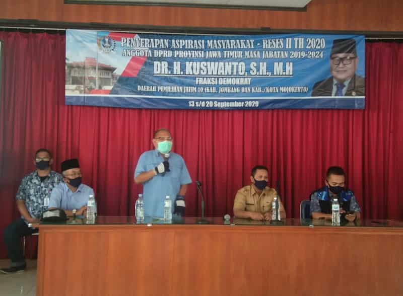 JATIMPOS.CO/JOMBANG - Serap aspirasi masyarakat atau reses II Tahun 2020 Anggota DPRD Jatim, dilakukan Dr. H. Kuswanto, SH.MH dari Fraksi Partai Demokrat, di gedung pertemuan Balai Kelurahan Kepanjen Kecamatan Jombang, Senin (14/09/2020).